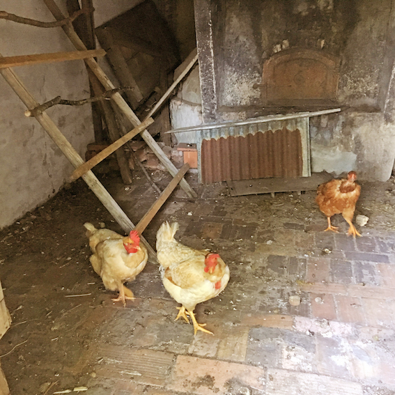 After a week or so of ‘training’ which involved haphazardly running around the fields at dusk with spades and horsewhips (us), the hens now understand that they should put themselves to bed in their new quarters and no longer in the horses’ barn. All of them, that is, except one. At bedtime she comes to sit resolutely on the boot room table squawking VERY loudly until Luc succumbs and carries her to bed. Just leave it to us to either acquire or create a noisily needy, attention-seeking, high maintenance hen…