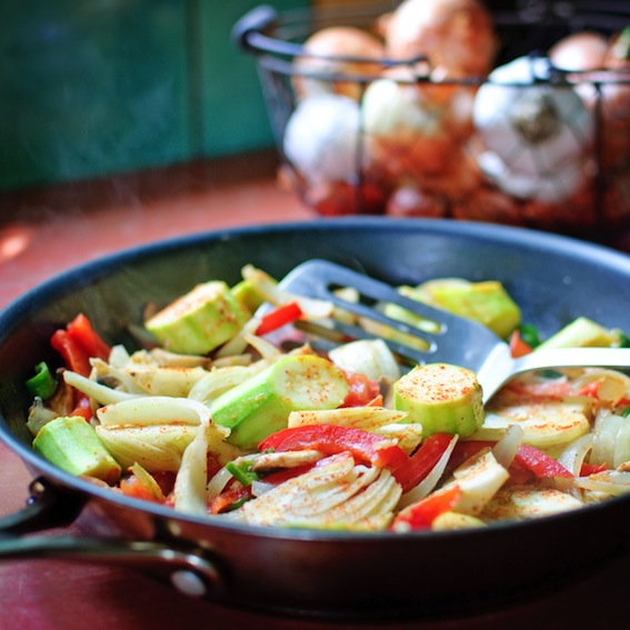 Heat the olive oil over a medium heat in a large cast iron pan. Add the onions and garlic and heat until softened. Add the tomato, pepper, fennel, courgette and seasoning, cover and leave to simmer over a medium heat, stirring occasionally for about 20 minutes or until the vegetables are softened, but not overcooked. Add the garnish before serving. -