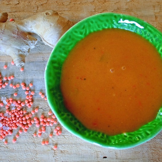 Gently fry the onions, leeks and garlic in olive oil for a few minutes. Once golden brown, add the peppers, carrots, ginger and seasoning. Then add the lentils and pour the stock over the top. Simmer for 30 minutes and then purée. Serve with crispy baguette, if at all possible free of doggie dribble. -
