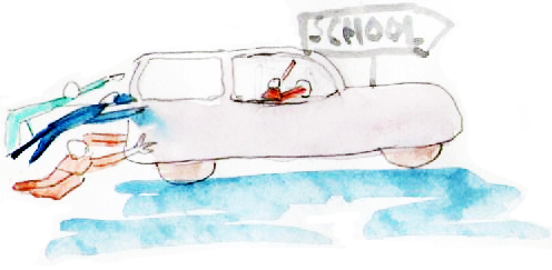 Yesterday afternoon, equipped with wetsuit and flippers (I won’t harp on about the weather — let’s just say that we’re in no imminent danger of drought), I sailed through white water torrents to fetch Léo. Upon arrival in front of the school, the car, possibly rebelling at being mistaken for a catamaran, spluttered and died. I had to comandeer several classmates and their mothers to help move the catamaran/car out of the way, the aim being that we would push while Léo steered to a less hazardous spot. So much for my theory; what actually happened is that he somehow managed to jump start the wretched thing, leaving us ‘pushers’ face-down in a puddle, our arms stretched out in front of us. I thought it probably best to avoid convoluted explanations with the headmaster who was looking, quite frankly, more than a little bewildered by the sight of one of his eleven-year-old pupils driving around the school car park with his squealing, hand-flapping, mud-speckled mother in wet pursuit…