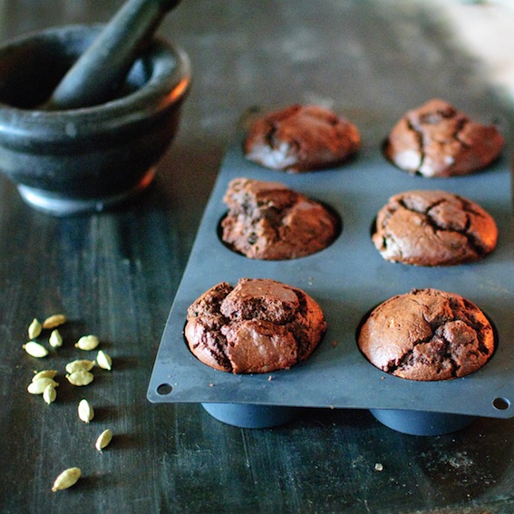 These muffins are a really rich double chocolate treat. Just in case you’re looking for an excuse to make them, both cardamon and dark chocolate increase serotonin levels in the brain. Amongst other things, serotonin helps ward off depression. And who doesn’t need a serotonin boost towards the end of the winter?
