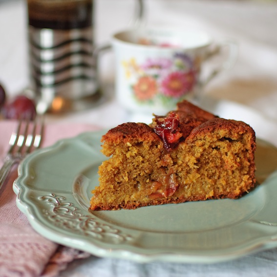 Preheat the oven to 180°C and prepare a 22cm loose-bottomed cake tin. Mix the dry ingredients and set aside. In a separate bowl, beat the egg yolks, softened butter and coconut oil and honey until thick and smooth. Gently fold into the dry ingredients. Whisk the egg whites in a clean bowl until stiff and then fold into the mix making sure they are fully incorporated. Finally stir in the plums and transfer the mixture to the greased tin. Bake for 45 minutes or until a skewer poked into the centre comes out clean. Leave to cool before serving.