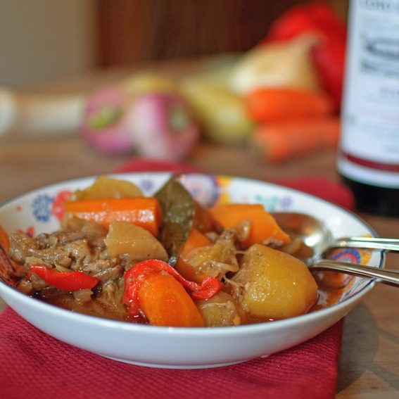 This is a simple version of ‘pot-au-feu’, a traditional French dish which, strictly speaking, should include several different cuts of meat as well as oxtail. In any case, it is very comforting after a day spent in the cold having your nerves ripped to shreds! It used to be that the pot containing the stew would stay cooking over the fire nearly all winter, with bits and pieces being constantly replaced. Usually the ‘bouillon’ or sauce is eaten as soup and the vegetables and meat as a main course with mustard and pickles, although I like to eat the two together.