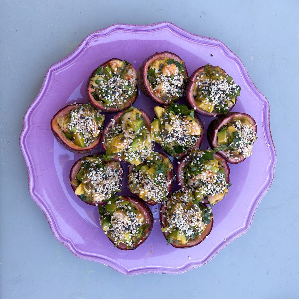 Arrange the halved and seeded empty passion fruit on a plate. Place the prawns and cut avocado in a bowl. Combine the olive oil, lemon, garlic, passion fruit juice, chives and seasoning and add to the bowl, mixing well. Fill the passion fruit shells with the mixture, and garnish with passion fruit and sesame seeds. Serve chilled!