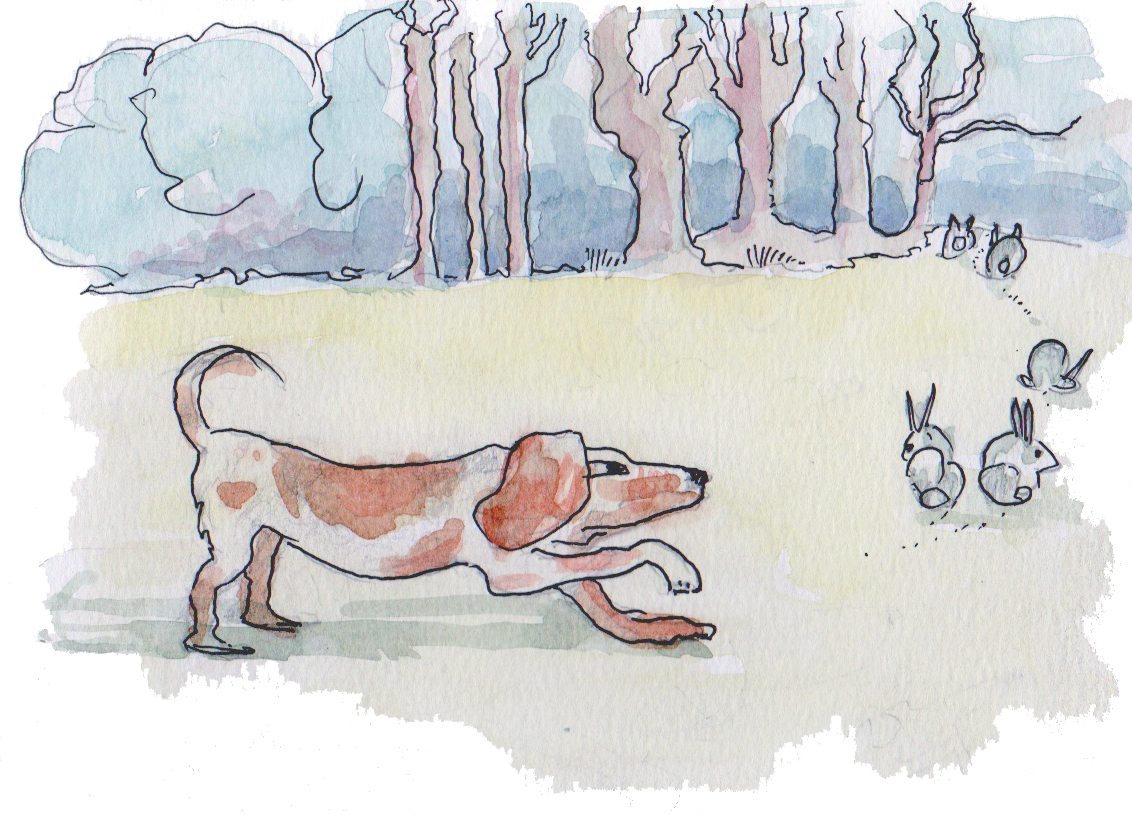 I think that Java might have experienced what we psychologists refer to as a psychotic break. Being surrounded by creatures – human and animal – of questionable sanity, I recently felt the need to go on a course, which is how I am in a position to say this. I’m not sure whether I should mention my diagnosis to Bossy or not; she thinks Java’s just an adorable scatterbrain and I don’t really want to be the one to break the bad news. Anyway, Java spends hours every morning and every evening gazing at baby rabbits with her head cocked and one foot in the air. She looks, frankly, more than a little bit foolish, and that’s being charitable. I mean, she’s a hunting dog so you’d think she’d try to catch them instead of staring at them gormlessly. I know that she’s bred to hunt birds, but it’s still very odd. I think that she’s probably waiting for them to spread their wings and fly away, but in view of the fact that they’re rabbits, that’s just not going to happen. I don’t put her straight though because while she’s busy being half-witted, I get some uninterrupted peace.