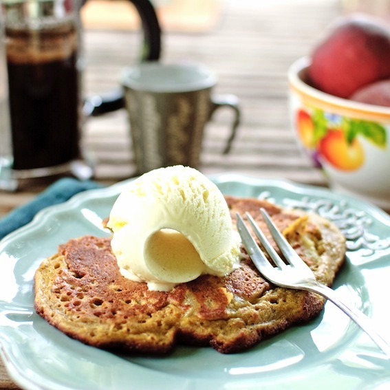 Mix the eggs with the milk. Sift the ground almonds, flour, bicarbonate of soda and salt together in a bowl and gradually add to the egg/milk mixture. Combine well and add the peaches and garam masala. Refrigerate for at least an hour. Heat a teaspoon of coconut oil in a frying pan and drop a large spoonful of pancake batter into the pan. Cook until golden brown, flip and repeat.