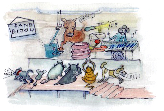 We’ve been sleeping with the all windows wide open to make the most of the slightly cooler night air, which means that I was woken at 3am a few days ago by a very noisy, metallic and somewhat unorthodox rendition of When The Saints Go Marching In. After a quick recce, which involved almost knocking myself out on a wooden beam, I came to the conclusion that I hadn’t actually fallen asleep in a sleazy jazz club, and the appalling racket was coming from the direction of the stables. Never underestimate my powers of deduction. Torch in hand, I soon discovered Bijou (our youngest horse) in full swing by the water trough, which I suppose must be the equine equivalent of a bar. He had got hold of two metal buckets, three tins, a broom and a hoof pick and was delighting in putting each item to maximum sonic use with the help of his hooves and surrounding walls, whilst strutting his funky stuff. The other horses were looking on slightly bemused and I don’t think I’m mistaken in saying that one of the more adoring hens (Bijou is very handsome) was tapping her foot in time to the surprisingly rhythmic din. Hugo and Java slept right through the performance – I don’t think they can be jazz connoisseurs.