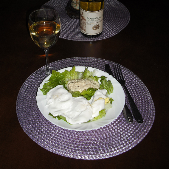 Dinner tonight was chicken breast sautéed in walnut oil with a clove of minced garlic, an abundance of chopped chives and poached for a few minutes in Prosecco, before draining out the remaining liquid and then gently browning the meat. The broccoli florets were steamed and then dressed with the liquid drained from the chicken/chives/garlic and then topped with finely grated (and aged) goat cheese, while the chicken was topped with the sautéed chives and minced garlic. A sprinkling of sea salt on the lot added just a bit more flavour to the meal. A glass of chilled Prosecco was a necessary complément, of course. While the photo may not be complimentary, I assure you my taste buds thoroughly enjoyed the event. -