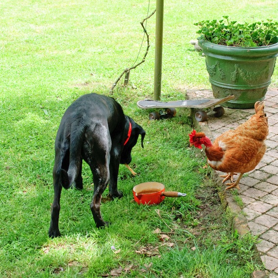 My best friend is a hen. Our friendship is based on mutual compassion – we are both victims of misunderstanding. The other day I was given some chicken bones to eat and, because I’m a generous sort of dog, I invited BHF to share them. I made it plain to the other hens that she was the only one invited; they tend towards vulgar, thuggish behaviour and gate-crashing. Luckily, I can be very intimidating *grrrr* , so they quickly got the message. I’m not sure that BHF knew she was cannibalising, but I didn’t explain because I know she has enough problems and a rather sensitive nature. Sometimes, when Bossy isn’t looking, I invite her into the house to eat from my food bowl. I’m working on a plan to sneak her in to watch television with me. My favourite programme is Scooby Doo and I think she’d like it too (did you like the internal rhyme? I’m learning about poetry at the moment). I think you’d agree that it would be worth it just to see Bossy in full meltdown mode *wicked doggy cackle*.
