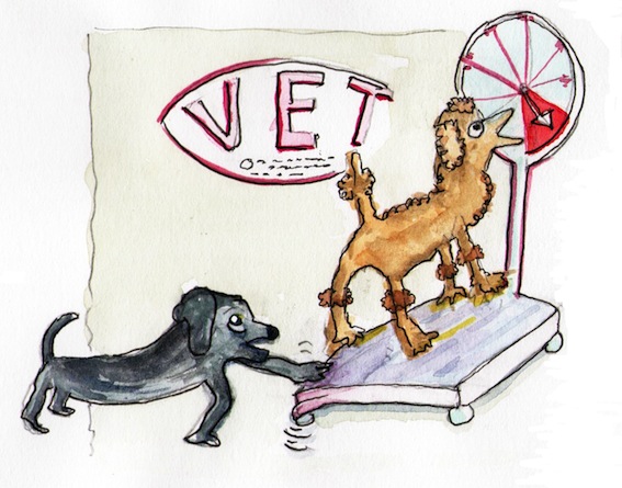 When Bossy wrote about my last visit to the vet, it wasn’t very complimentary, so, in the interests of accuracy, I’m doing this one. I behaved beautifully in the car, even though I have never understood why they insist on putting me in the boot. I didn’t even bark or throw myself against the car windows when I saw other animals. When we arrived, I amused myself by playing on the scales. If you stand on them with two legs instead of four you lose weight and if you get on and off enough times you send the electronics doolally and they stop working altogether *very naughty chortle*. Then a bitch arrived and things went downhill. I think it was love at first sight for her because, after just one look at me, she started straining on her lead so much that her owner became quite red in the face and started saying words that I’d never heard before. Although she wasn’t really my sort, I reciprocated by howling like a wolf – a very very loud wolf – to be polite. She obviously saw this as a come-on because she became quite hysterical – so much so that she scared me a bit and I had to hide behind Bossy and Noisy’s chairs. The vet lady came out of her office and told us both off, although it was quite obviously the bitch’s fault and not mine. She was sent off to wait in her car in the end. I think I might have to stop going to see the vet because it’s very tricky and really rather tiring being so irresistible to lady dogs, especially in public places.