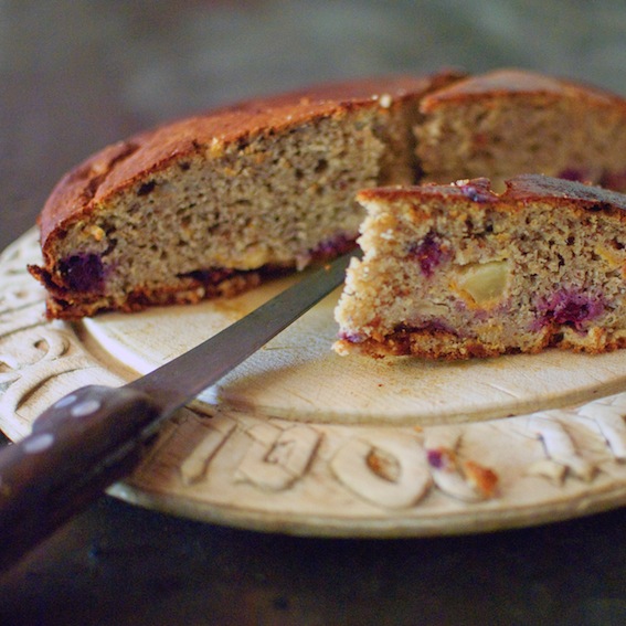 Preheat the oven to 180°C. Add the fruit and honey to a saucepan and gently heat until softened. Mix the ground almonds, flours, spices, bicarbonate of soda and spices in a bowl and set aside. Whisk the sugar and eggs together until well combined and then add the olive oil and yoghurt. Add the flour mixture to the wet mixture and then stir in the fruit. Pour the mixture into a buttered medium-sized cake tin and bake for 40 minutes or until a fork comes out clean. -
