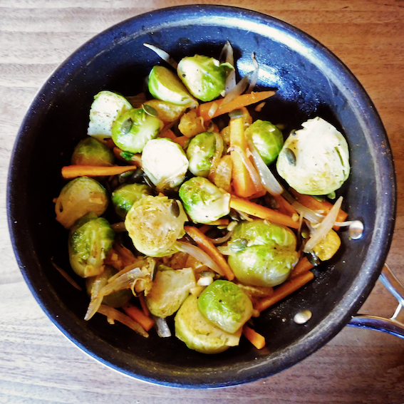 Cook the Brussels sprouts briefly in salted boiling water for about five minutes, drain and set aside. Heat the olive oil in a large frying pan and fry the shallots and garlic until golden. Add the sprouts and carrots and cook until the carrots soften a little (about five minutes). Add the pumpkin seeds, flaked almonds, satsuma pieces, seasoning and honey and cook for another few minutes until everything is honey-coated. Serve! -