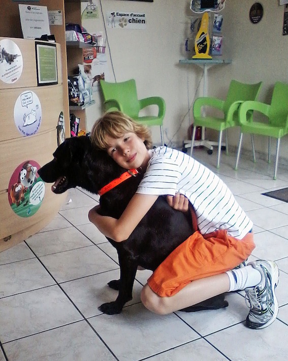 Unsurprisingly, Hugo’s annual visit to the vet is not something I particularly look forward to. I wouldn’t wish to shame my faithful friend (especially in view of our slightly volatile working relationship), but I suspect the vet might share my feelings. In a nutshell (nut being the operative word), during his last visit, he took out a cat, threw himself at a plasterboard wall leaving a significant hole and broke a table leg. He also refused to lie on the floor, preferring instead to avail himself of the chairs. I can’t even blame his appalling behaviour on white coat hypertension – the vet is always rewarded with huge, slobbery kisses for her courageous attempts to calm and vaccinate him (from Hugo, not me). I think it’s a simple case of overexcitement at the idea of being in an enclosed space with so much potential chase fodder. This time, as it was impossible to hold him on his lead (his brute force would be a match for a prize bull), bad mother and even worse pet owner that I am, I resorted to using Léo as a human straitjacket. It wasn’t ideal (I had to haul them both out from under the reception desk), but at least there was no structural damage to the surgery, which can only be a good thing. I do realise that I’m setting the bar pretty low in terms of canine obedience, but everyone has to start somewhere. In our case that appears to be rock bottom.