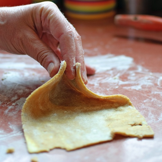 To make the pastry, begin by cutting the butter and into small cubes. Sift the flours and a pinch of salt together into in a mixing bowl, also adding the cubes of butter. Rub in and blend by hand until the mixture becomes crumbly. Add the olive oil and combine well and then add the cold water, mixing rapidly with a spoon. Remove the mixture from the bowl onto a lightly floured surface. Knead until you obtain a ball of pastry (if the mixture isn’t ‘sticky’ enough to form a ball, you may need a drop more water). Wrap in a clean cotton tea towel or some cling film and leave to ‘rest’ in the fridge for about two hours. This relaxes the dough and makes it easier to use.
