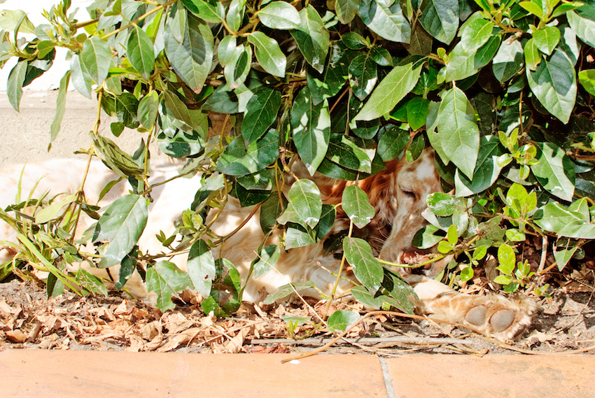 Although Java The Guard Dog has been sleeping outside during the hot weather (by ‘sleeping’ I mean running round and round the house all night, like a maniac), one of our resident deer has been sneaking midnight snacks, apparently consisting of Léo’s grapevine leaves, with a side order of my geranium flowers. As the geraniums are on the terrace attached to the house, this is pretty unabashed as petty crime goes, but Java, who is only interested, randomly, in guarding the compost heap, has been of no use whatsoever. There were no such unlawful goings on during Hugo’s watch, I can tell you. Java, get your act together!