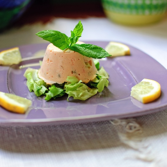 Place the salmon filets steeped in lemon juice in a frying pan and add the butter and cream. Bring to a gentle simmer and add all the other ingredients with the exception of the Agar-Agar, cucumber and mint leaves. Simmer for about 10 minutes, until the salmon is cooked through and the liquid partly evaporated. Once cooked, add the mint leaves, blend briefly in a food processor and set aside. Dissolve the Agar-Agar in a small amount of water and bring to the boil (according to the instructions on the packet). Once boiled, mix into the salmon with the diced cucumber and distribute the mixture into moulds (I used silicon muffin moulds). Compact the mixture well. Refrigerate for at least a couple of hours and serve chilled.