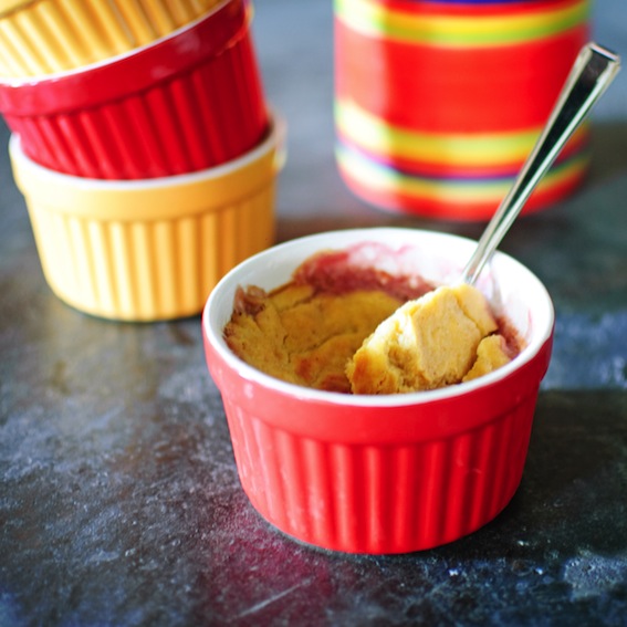 Preheat the oven to 180°C. Prepare the ramekins by lining the bottom with six or seven frozen raspberries or a tablespoon of raspberry jam. Put the flour, dessicated coconut, coconut milk, vanilla essence and nutmeg into a heavy-bottomed medium-sized saucepan and heat gently, whisking continuously until the mixture thickens. Add the egg yolk, mashed banana, sugar and raisins and return to the heat, again whisking well, for a few minutes. Pour the mixture into the ramekins, filling to about 1cm from the top. Bake for 20 minutes and then chill for a couple of hours before eating. -