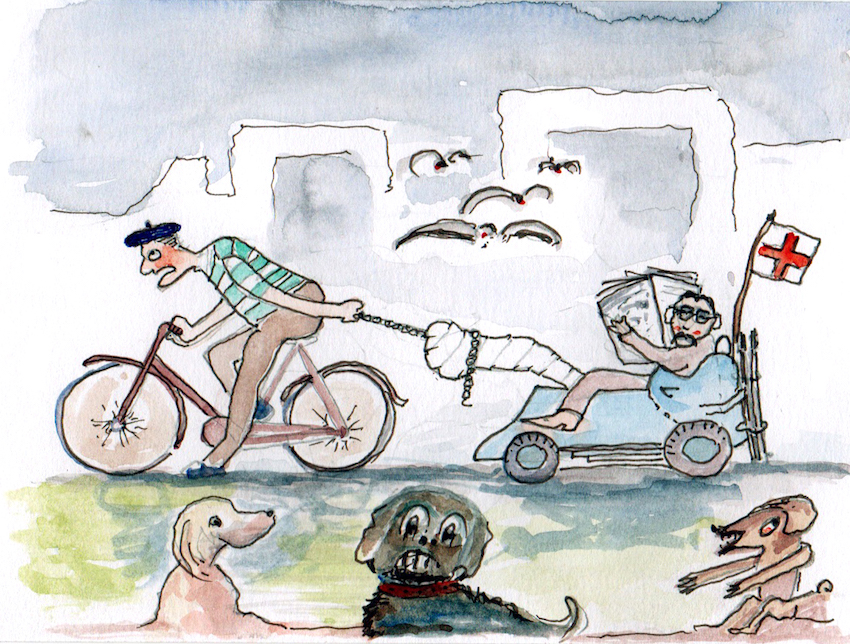 Home bears a close resemblance to an Accident and Emergency Unit at the moment. To start with, no fewer than 25% of the human knees here are toast. Burnt toast in fact. One knee belongs to The Tall One, and the other belongs to a friend who is staying with us. Both bad knees are as a result of interaction with horses; I have made my point and will say no more on the matter. The butcher told the Tall One that cycling was excellent for the sort of knee injury he has, which means that he pedals absolutely everywhere, even when pushing (or pulling) his friend’s wheelchair. Never mind the knee, what about his sanity?