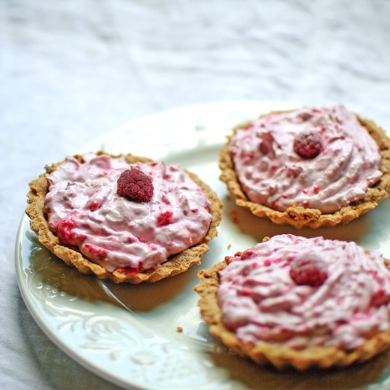 Blend all of the ‘cheesecake’ ingredients together well, keeping a few raspberries aside for garnish. Fill the precooked tart cases and decorate the tops with the set-aside raspberries. Chill for at least an hour before serving.