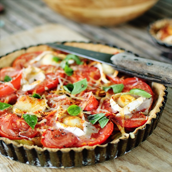 Preheat the oven to 180°C. Fry the leek, onions, garlic and courgette in the olive oil until soft (about 15 minutes). Add the seasoning and honey and set aside. Roll out the pastry and line a tart tin . The pastry will be quite crumbly so you’ll need to be gentle and patch up the holes (I’ve become quite an expert ;-)). Blind bake the pastry for 12 minutes and then fill with the onion mixture, adding the sliced tomatoes, goat’s cheese and basil on top. Sprinkle the top with black pepper and little more paprika and bake for about 20 minutes. Serve hot.