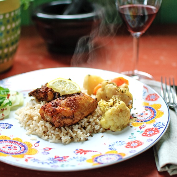 Slash the chicken thighs several times then cover them with the lemon juice and chopped onions. Set aside in a deepish dish. Mix the marinade ingredients together and pour over the chicken, making sure that all bits are well covered. Leave to chill for at least an hour or overnight if possible. Preheat the oven to 220°C. Carefully place the chicken thighs on a lightly oiled baking tray and cook for about 25 minutes, depending on the size of the thighs. They are cooked through properly when the juice runs clear when prodded with a fork. May be served with basmati rice, naan bread, chickpea pancakes (recipe here), or vegetable curry. Delicious with chutney too.